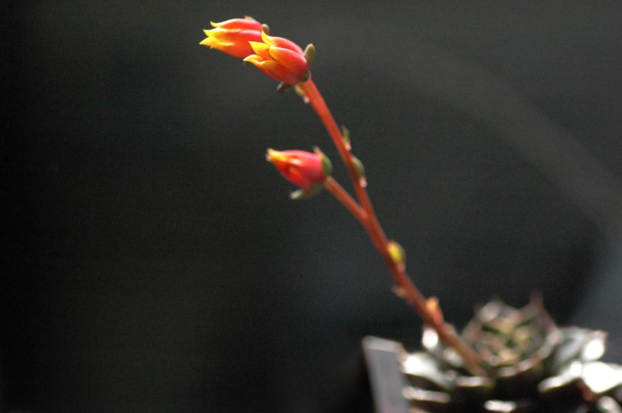 これは「咲いた」写真ではないですが、ハオルチア属は年中小さな白い花を咲かせています。