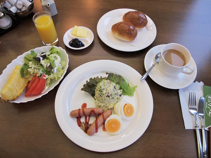 ソーセージ、ポテトサラダ、ゆで玉子、温めたロールパン、ブルーベリージャム、サラダ、パイナップル、オレンジジュース