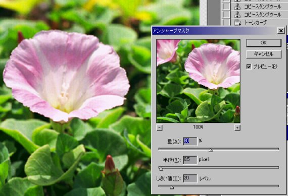 フィルターメニュー→シャープ→アンシャープマスクを選択します。