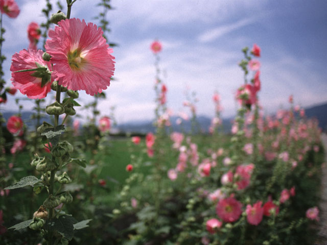 ハナアオイ農道は田んぼの用水路に沿ってタチアオイ(ハナアオイは別名)が延々と植栽されていて見事です。