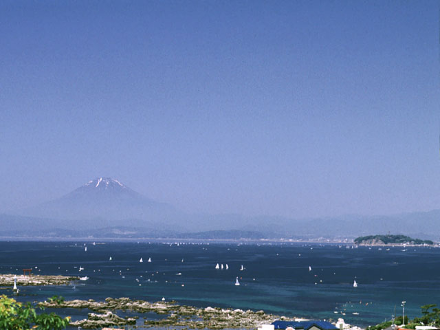 右に浮かぶのは江ノ島。