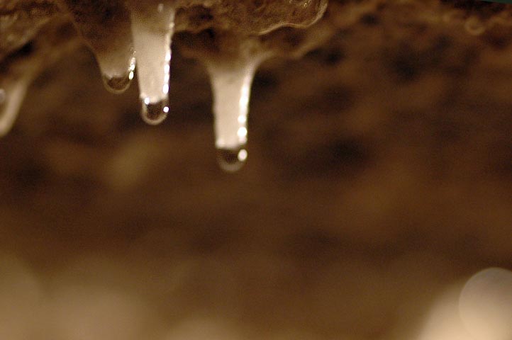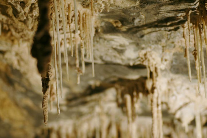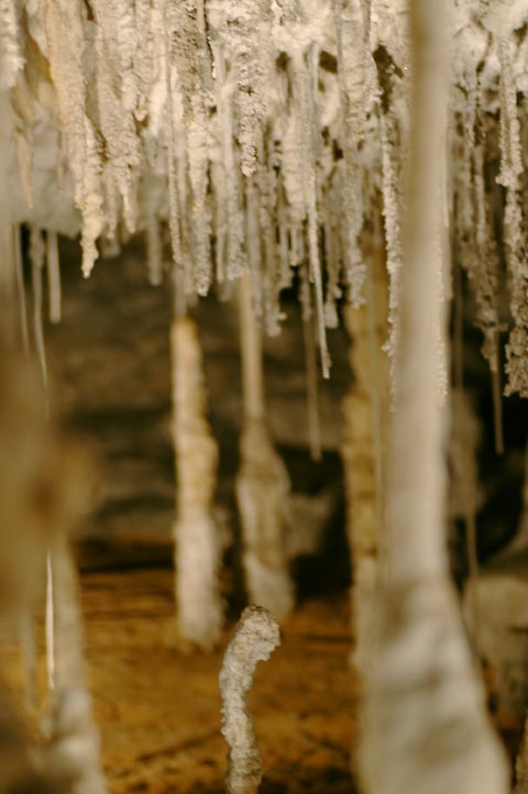 常に一定方向に空気が動いているらしく、鍾乳石が垂直ではなく斜め下に成長しています。