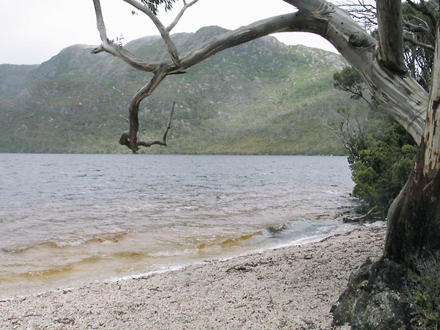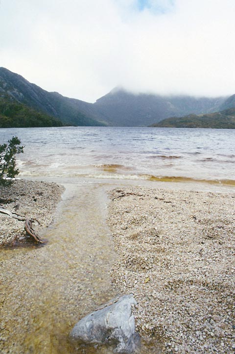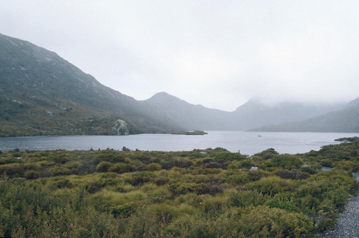 右奥のクレイドル山 Cradle Mt. は雲に覆われています。