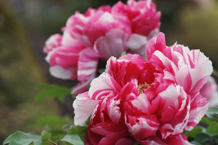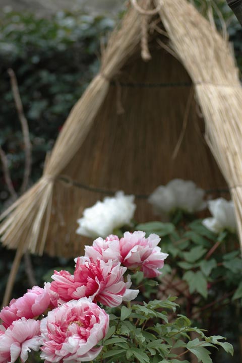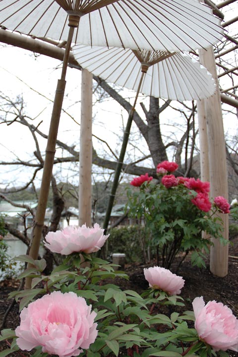 太鼓橋の手前を右に入ると源氏池に沿って神苑があり、ボタンが植栽されています。