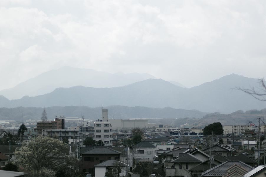 右端は仏果山、その左は高取山、間のくぼんだ部分は半原越えと呼ばれる峠です。