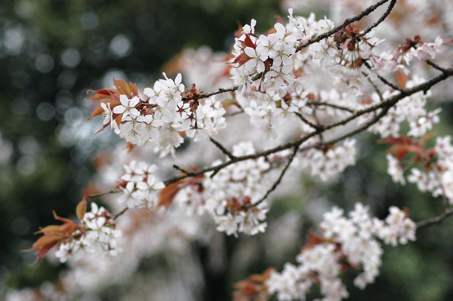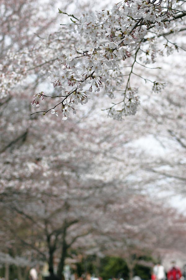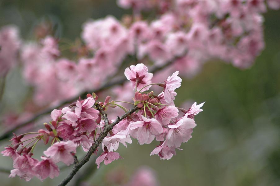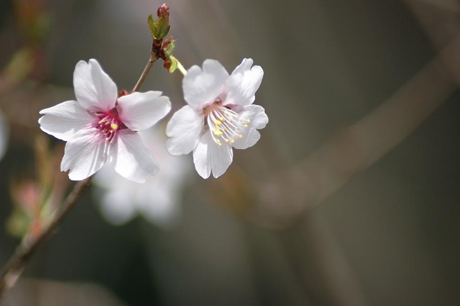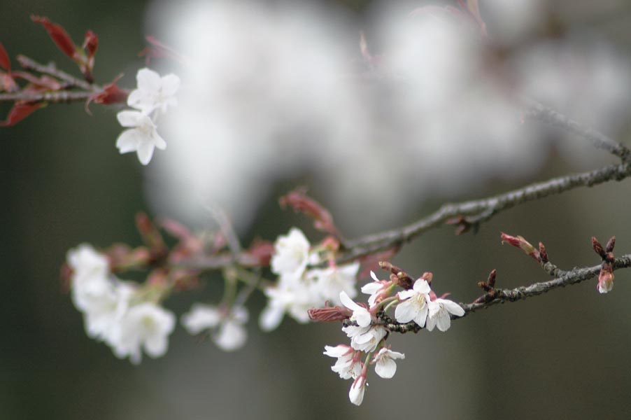 染井吉野に比べると色が薄く、花着きがまばらですが、