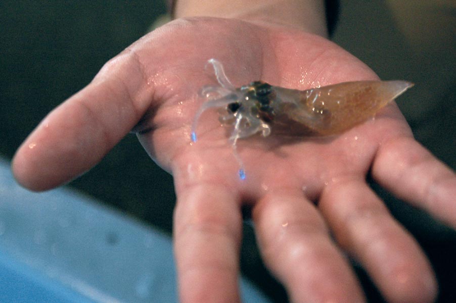 刺激をあたえて驚かせると、足の先にある発光器が強く光ります。