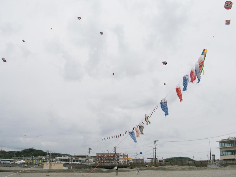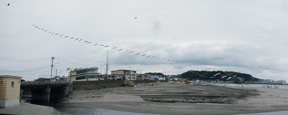 材木座海岸まで出ると、滑川河口付近の浜で巨大な凧がいくつも揚がってます。