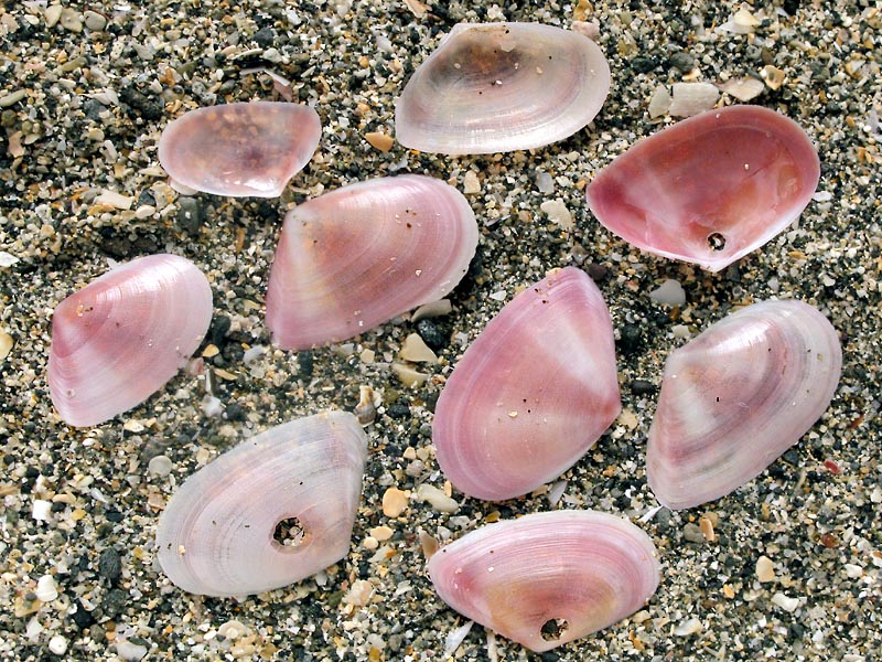 打ち上げられている二枚貝の死殻にはタマガイ類に開けられた孔がよく見られるのですが、