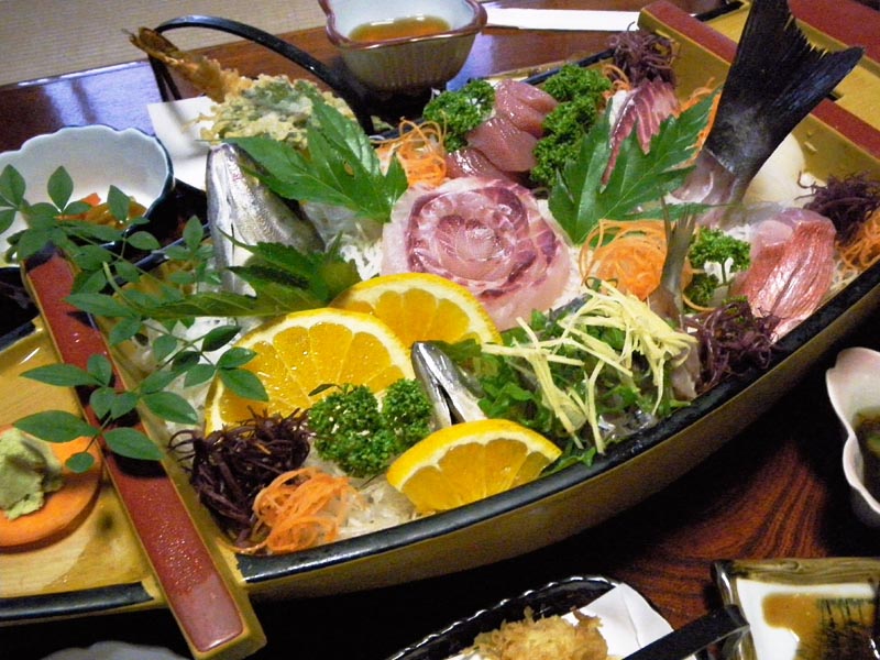 舟盛り、金目鯛のしゃぶしゃぶ、金目鯛の煮付け、サザエの壺焼き、