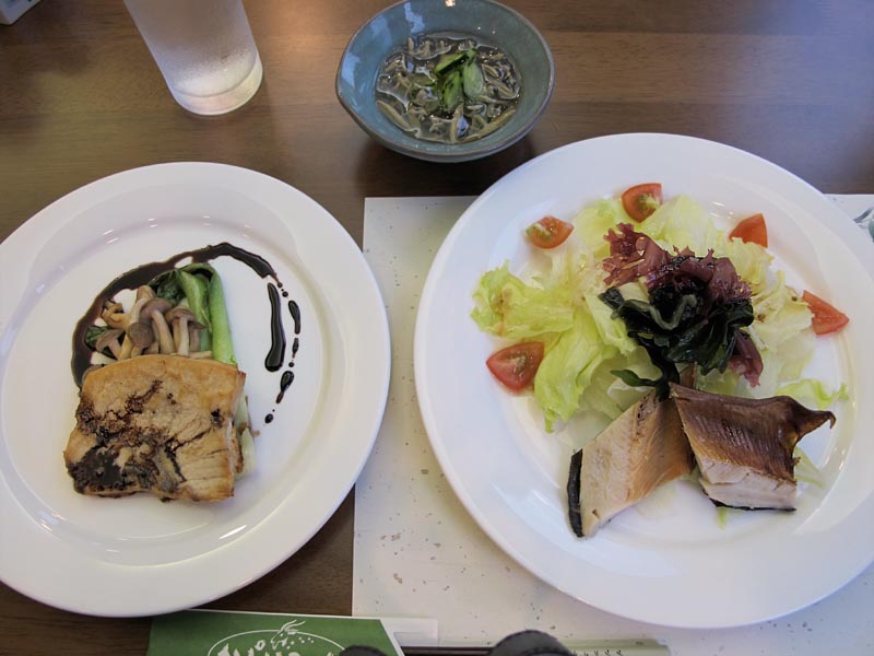 めかじきのムニエルバルサミコソース、山女の燻製、じゅん菜の酢の物