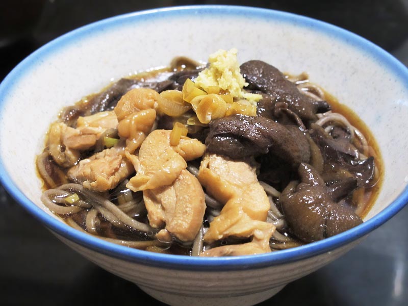まず、鶏肉とアミタケでかけそばに。薬味はおろししょうがで。