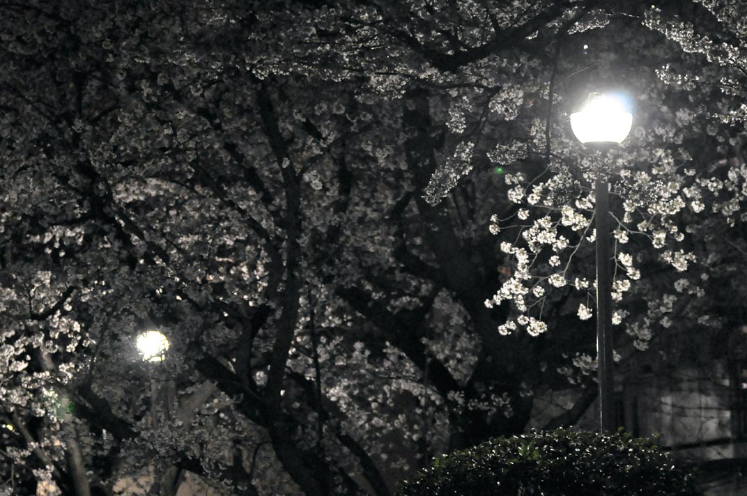 夜桜を楽しむ人達がまばらにシートを広げて飲んでいます。