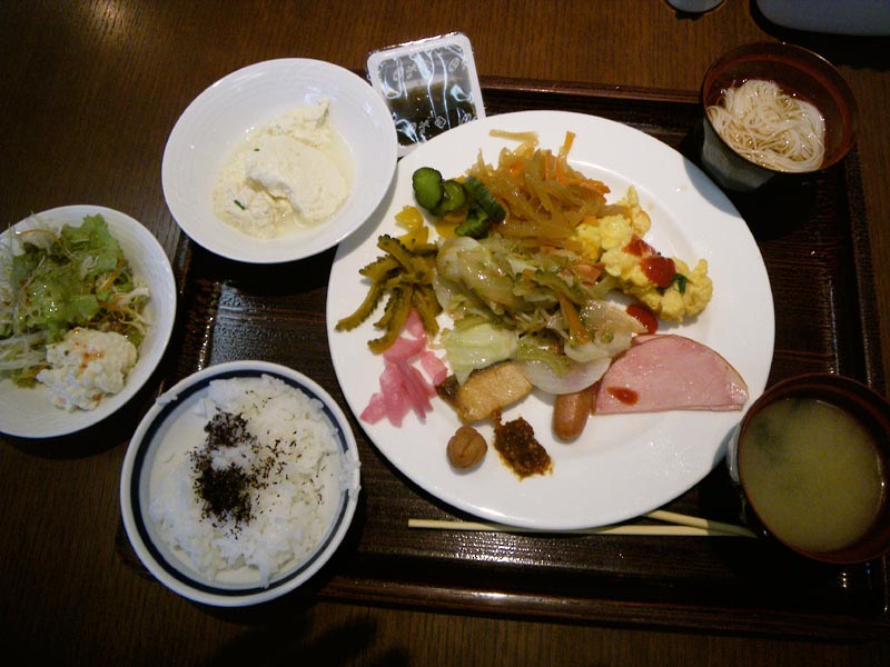 ゴーヤチャンプルー、パパイヤの炒め物(パパヤーイリチー)、炒り卵、ハム、ソーセージ、焼き鮭、